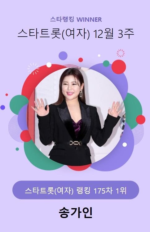 [스타뉴스|한해선기자]/사진=스타랭킹가수송가인이스타랭킹스타트롯여자부문에서175주연속1위를차지했다.송가인은지난12일오후3시1분부터19일오후3시까지진행된12월3주(175차)스타랭킹스타트롯여자부문랭킹부문에서1위를수성했다.송가인은이번투표에서7만1134표를얻고175주째정상에올랐다.이번주투표2위는김태연(4만6522표),3위김다현(4만4009표)으로지난주와TOP3는같다.한편스타랭킹은팬들이직접자신의최애스타에투표해순위를결정하는랭킹투표다.투표결과순위에따라스타에게다양한특전이제공된다.4주연속1위로선정된스타는옥외전광판광고에실린다.4주연속1위스타의팬들은옥외전광판광고영상팬서포트도가능하다.제안은스타뉴스공식이메일([email protected])로하면된다.한해선기자[email protected]©스타뉴스&starnewskorea.com,무단전재및재배포금지