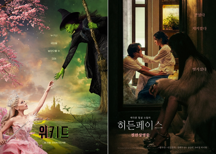 핵심요약브로드웨이인기작을영화화한뮤지컬영화'위키드',전세계최초국내개봉'방자전''인간중독'감독,밀실스릴러'히든페이스'로10년만에스크린복귀영화'위키드'와'히든페이스'포스터.유니버설픽쳐스,NEW제공브로드웨이인기작을영화화한뮤지컬영화'위키드'와색(色)다른밀실스릴러'히든페이스'가오늘(20일)부터'글래디에이터2'의자리를놓고맞대결에나선다.전세계최초국내개봉하는'위키드'(감독존추)는전세계6천만명관람과50억달러(한화약6조9675억원)의흥행수익을기록은물론토니상,그래미상등100여개의어워즈를휩쓸며많은사랑을받아온뮤지컬'위키드'를영화화한작품이다.영화를연출한존추감독과프로덕션디자이너나단크로리는위키드의세계관과오즈의문화를섬세하게구현해몰입감을높이고자노력했다.실제로북미시사회이후"올해최고의영화!브로드웨이뮤지컬을스크린으로구현한최고의사례""대형스크린에서펼쳐지는스펙터클한오즈의세계관정말완벽하고놀랍다"등의평가를받았다.영화'다크나이트'시리즈,'인터스텔라''덩케르크'등의프로덕션디자이너나단크로리는이번작품에참여하며"'위키드'는지금까지내가맡아온프로젝트중가장큰도전이었고,이도전은디자인에대한나의기쁨을다시불러일으켰다"라고밝혔다.그는실제로동부영국의노포크라는광활한대지에900만송이의튤립을직접심으며먼치킨랜드에생명력을불어넣었다.여기에마법사의초대로에메랄드시티로향한엘파바가탑승하는기차인에메랄드시티익스프레스또한58톤의무게를자랑하는거대한기차를시계장치의정밀함이라는콘셉트와녹색의세련된이미지를결합해탄생시켰다.'위키드'의매력은이뿐만이아니다.엘파바를연기한신시아에리보와글린다역의아리아나그란데는압도적인가창력으로모든넘버를라이브로소화했다.이에존추감독은"최고의콘서트를VIP석에서관람하는것같은경험이될것"이라고자신했다.영화'위키드'와'히든페이스'스틸컷.유니버설픽쳐스,NEW제공'방자전''인간중독'을통해금기된사랑과욕망을그려내며'에로티시즘'에한획을그은김대우감독은동명영화를리메이크한'히든페이스'로관객들과만난다.'히든페이스'는실종된약혼녀수연의행방을쫓던성진앞에수연의후배미주가나타나고,사라진줄알았던수연이그들과가장가까운비밀의공간에갇힌채벗겨진민낯을목격하며벌어지는색(色)다른밀실스릴러다.영화의관전포인트중하나는밀실에갇혀연인의정사를관음하게되는파격적인작품의설정과미술이돋보이는공간의연출이다.밀실에갇힌수연이약혼자성진과첼리스트후배미주의정사를가장가까운곳에서목격하면서사건은극으로치닫는다.특히이장면에서의섬세한조명배치는밀실안팎의뚜렷한명암대비를보여주며캐릭터들의역전되는관계와감정변화를고스란히드러내극의몰입감을극대화한다.또한세인물의얽히고설킨관계는밀실을중심으로말하지못하는비밀과들여다보지않았던내면을입체적으로그려내는영화는반전을거듭하며관객들의허를찌를예정이다.실제로배우송승헌,조여정과의재회는물론한계없는연기스펙트럼을선보인박지현과의첫만남은관객의기대감을높이고있다.이들은밀실을둘러싼각기다른욕망을드러내는성진(송승헌),수연(조여정),미주(박지현)을효과적으로표현하며역대급연기변신을선보이며극의완성도를높였다.※CBS노컷뉴스는여러분의제보로함께세상을바꿉니다.각종비리와부당대우,사건사고와미담등모든얘깃거리를알려주세요.이메일:[email protected]카카오톡:@노컷뉴스사이트:https://url.kr/b71afnCBS노컷뉴스최영주기자[email protected]▶기자와카톡채팅하기▶노컷뉴스영상구독하기Copyright©노컷뉴스.무단전재및재배포금지.