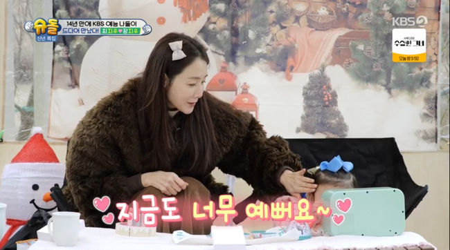 [OSEN=김예솔기자]최지우가장지우를만났다.8일방송된KBS2TV‘슈퍼맨이돌아왔다’에서는최지우가장동민의본가가있는원주로찾아가장동민의딸장지우를만났다.이날최지우는장동민의딸장지우를만났다.최지우는"지우가블루를좋아하고리본핀을좋아하더라"라며서로핀을꽂아줬다.이모습을본장동민은"사람이랑저렇게빨리친해지는건처음본다"라며아빠장동민과있을때와다른온도차를보여주위를폭소케했다.장동민은"지우가지우이모옆에있으니까얌전하게논다.아빠랑있을때와다르다"라고말했다.안영미역시공감하며"애가화사하다"라고말해웃음을자아냈다.최지우는딸엄마답게지우에게맞춤놀이와육아를선보였고장지우는최지우에게뽀뽀하며행복해했다.장동민은"지우이모와지우가평행이론이다.둘이6월생이다"라며"우리지우도크면최지우이모처럼예뻐질까"라고말했다.장지우는최지우를보며"이모는뭘먹고이렇게예뻐졌어요"라고물어분위기를훈훈하게했다.이날장동민은최지우도얄짤없다며특훈을시작했다.이에최지우는화려한꽃무늬에일바지를입고등장해눈길을사로잡았다./[email protected][사진:KBS2TV‘슈퍼맨이돌아왔다’방송캡쳐]Copyright©OSEN.무단전재및재배포금지.