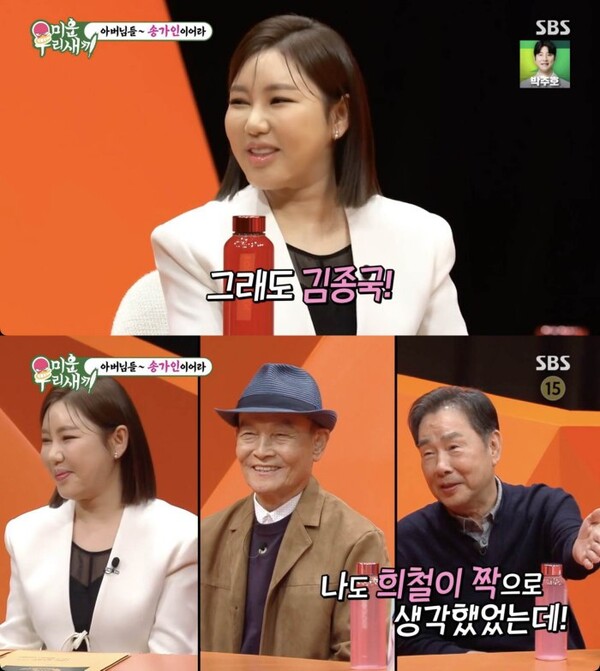 [스포츠한국신영선기자]가수송가인이이상형인김종국이전재산을잃어도선택할거라고밝혔다.10일방송된SBS'미운우리새끼'에서는김종국,김희철,허경환,이동건의아버지가스튜디오에출연한가운데송가인이스페셜MC로함께했다.이날MC신동엽은송가인의이상형이김종국이라고밝혀김종국아버지를웃게했다.송가인은김종국의아버지에게"아버님안녕하세요.가인이어라"라고인사했다.김종국아버지는"상당히곱게보고있다"며송가인을칭찬했다.이에김희철아버지는"나도희철이짝으로생각했었다"며"희철이랑은세살차이다.다알고왔다.예쁘게왔는데정말예쁘다"라고관심을보였다.신동엽은"예전에종국이가진실게임하면서희철이한테만약송가인이사귀자고하면사귈거냐고하니까무조건사귄다고,자기는제2의도경완이되겠다고했다"고에피소드를소개했다.송가인은"제가거절했다"라고선을그어웃음을자아냈다.그러자허경환아버지도"우리경환이도붙어볼수있는게5살차이다"라며"나이가딱맞다"고어필에나섰다.송가인은전재산을잃고근육도빠진김종국과김희철,허경환,이동건중한명과결혼할수있다면누구를선택하겠냐는질문에"그래도김종국"이라며"돈은제가벌면되고운동은다시하면된다"고답했다.이어김종국아버지를"아버님"이라부르며너스레를떨었다.스포츠한국신영선기자[email protected]©스포츠한국.무단전재및재배포금지.