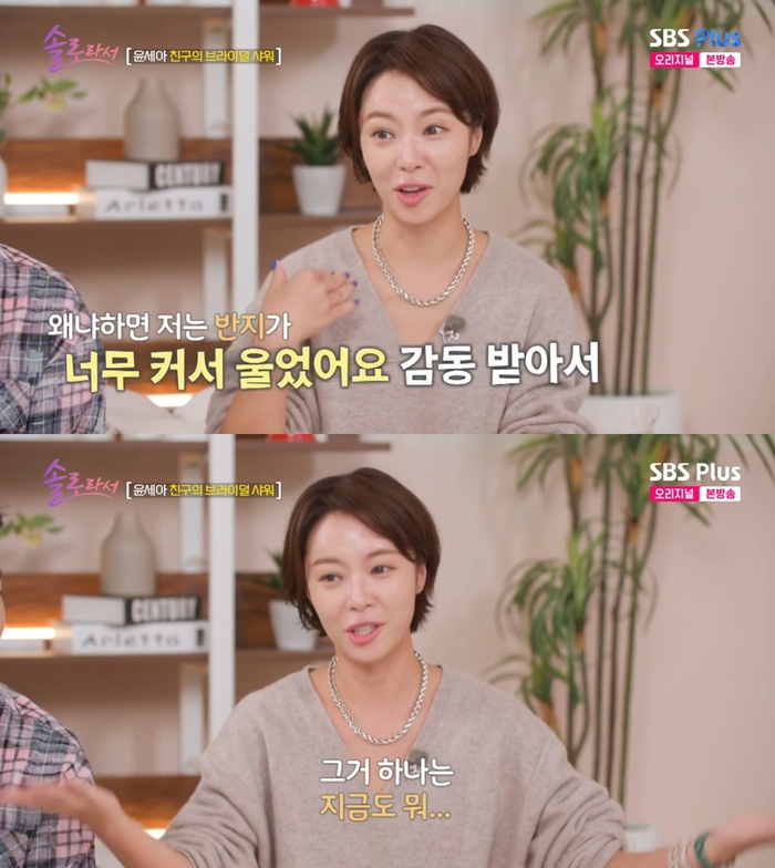 ‘솔로라서’.사진ISBSPlus,E채널‘솔로라서’방송캡처배우황정음이전남편의프러포즈를회상했다.19일방송된SBSPlus,E채널‘솔로라서’에서는결혼을앞둔친구를위해깜짝이벤트를준비하는윤세아의모습이그려졌다.이날윤세아는브라이덜샤워의주인공인친구에게커피심부름을부탁했다.친구가커피를사러간사이,윤세아와매니저는깜짝브라이덜샤워를준비했다.윤세아와매니저는친구를위해노래도불렀다.이때친구의예비신랑이등장해프러포즈를했고,이를본윤세아와매니저는눈시울을붉혔다.모두가감동한가운데,황정음은전남편의프러포즈를떠올리며“저순간은나도기억난다.나는반지가너무커서감동받아서울었다”고해웃음을자아냈다.이어“그거하나는지금도괜찮다.그건좋았다”고너스레를떨었다.한편‘솔로라서’는매주화요일오후8시40분방송된다.[이세빈스타투데이객원기자]Copyright©스타투데이.무단전재,재배포및AI학습이용금지