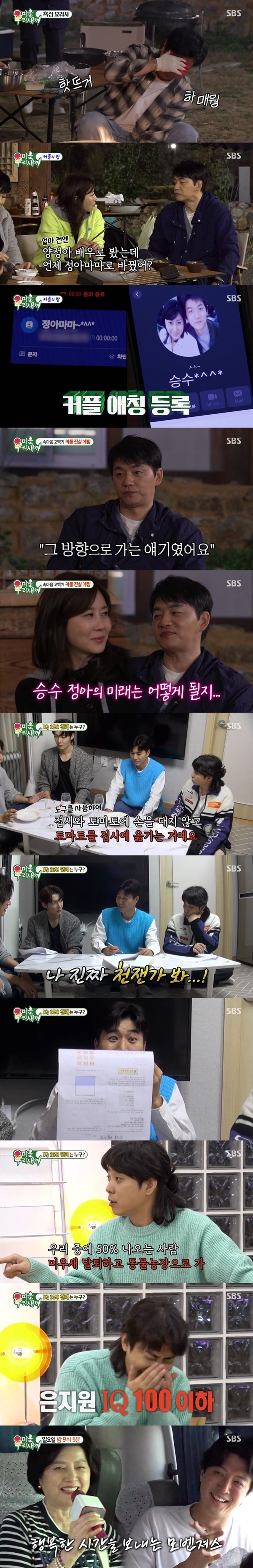 이번주‘미운우리새끼’에서는지난주에이어김승수♥양정아,안문숙♥임원희네사람의설레는더블데이트가이어졌다.지난주두커플의남이섬데이트에대한시청자들의폭발적인호응은이번주에도어김없이이어졌다.이같은화제성에힘입어3일방송한SBS‘미운우리새끼’는2049시청률3.8%,수도권가구시청률은14.2%로2049와수도권가구시청률모두tvN드라마‘정년이’를제치며주간예능1위를기록했다.밤이되어숙소에도착한네사람은남녀방을나누어휴식을취했다.임원희는김승수에게“솔직히둘이사귀는것맞지?그때놀이동산데이트하고귓속말로뭐라고한거냐”라며질문을던졌고,김승수는“집에서3~4시간멍하니정아생각을하긴한다.정말특이한관계이기는하다”라며양정아를향한감정을인정하면서도좀처럼귓속말내용을답하지않아야유를자아냈다.이번주‘미운우리새끼’에서는지난주에이어김승수♥양정아,안문숙♥임원희네사람의설레는더블데이트가이어졌다.지난주두커플의남이섬데이트에대한시청자들의폭발적인호응은이번주에도어김없이이어졌다.이어저녁식사를준비하기시작한네사람.임원희는불피우기를담당했지만,토치화력을조절하지못하고눈썹을태울뻔하거나,김승수가요리에쓸볏짚을써버리는등허당미를연발하며폭소를자아냈다.한편김승수가핸드폰에양정아를‘정아마마’로저장한사실이밝혀지며모두가술렁였다.그러나양정아는“얼마전까지는양정아배우였는데언제바뀌었냐”라고날카로운질문을던졌고,두사람의애정가득한투닥거림에당황하는임원희의모습에폭소가터져나왔다.이어AI로합성한두사람의미래2세예상얼굴이공개되자,임원희는“어우빨리낳으세요”라며두사람의결혼을적극추천했다.승수母역시“우리아들어릴때랑비슷하다”리며놀라워했다.진실게임에서안문숙은양정아에게“김승수와박형준이동시에고민하면김승수를선택하겠냐”라는질문을던졌지만,양정아는대답대신벌주를선택했다.안문숙은재차“(생일데이트에서)승수가했던귓속말은고백이었냐”라는질문을던졌고,양정아는다시한번대답대신벌주를택했다.얄궂게도다음차례에같은질문을받게된김승수는“(고백)그방향으로가는얘기였다”라고밝혀모두를놀라게했다.MC서장훈은“이제남은건결혼밖에없다”라며기쁨을숨기지못했다.김종민과은지원,최진혁이상위지능2%,IQ148이상만가입가능한멘사시험에도전해화제가되었다.평소방송에서보여줬던비범한행동으로‘천재가아닌가’라는의심을간간이들어왔던김종민과은지원,그리고영재반출신인최진혁의조합에스튜디오는기대감으로술렁였다.은지원의IQ가146,최진혁의IQ가141이라는사실이밝혀지며한껏분위기가달아오른가운데김종민은“전어렸을때높은데서떨어졌다.그이후로공부하기가싫더라고”라고해맑은대답으로폭소를자아냈다.그러나김종민은손을대지않고와인잔을사용해접시에방울토마토를옮기는미션을간단하게해결하는가하면,사전테스트의문제를척척풀어내며‘본업천재’의면모를뽐냈다.최진혁은“형생각보다너무똑똑해서실망이다”라고아쉬워했고,은지원역시“이제캐릭터없어져서일싹다끊긴다”라고독설을날렸다.이장면은최고17.8%까지올라‘최고의1분’을기록했다.드디어입회테스트결과를확인한세사람.“IQ100이안되면미우새말고동물농장에출연하자”라던은지원의IQ를확인한세사람은박장대소했고,마지막으로‘바보들의희망’이된김종민이떨리는마음으로결과를확인했다.김종민역시불합격했지만,세사람중에는가장높은IQ를받아들고기뻐했다.이날방송마지막에는놀랍게도아버지들이스튜디오에등장했다.지난父子여행이후로母子여행을떠난미우새아들들의행복한순간이예고되며한껏기대감을높였다.SBS‘미운우리새끼’는매주일요일밤9시5분에방송된다(끝).[금빛나MK스포츠기자][ⓒMK스포츠,무단전재및재배포금지]Copyright©MK스포츠.무단전재및재배포금지.