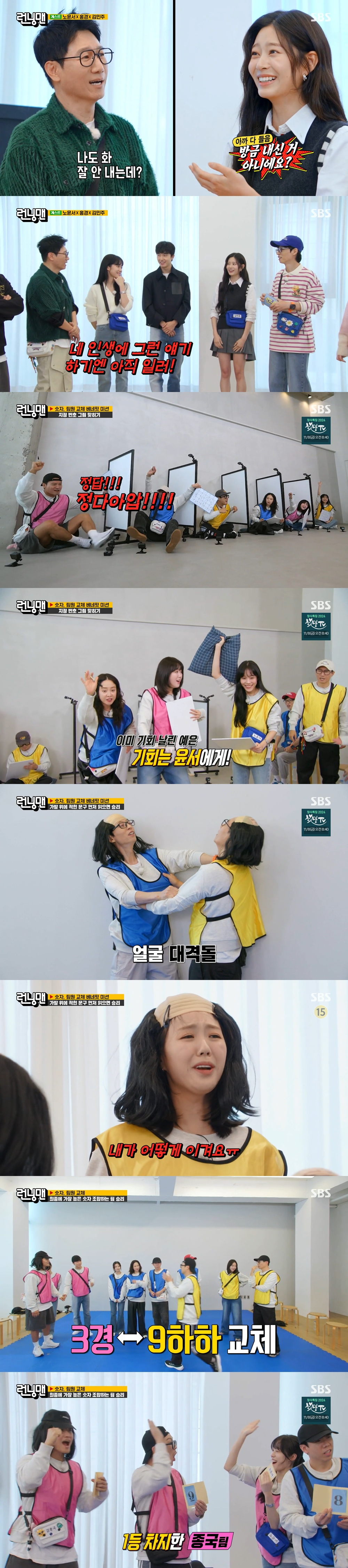 [스타뉴스|윤성열기자]/사진='런닝맨'방송화면배우노윤서와홍경,김민주가출격한'런닝맨'이안방극장에큰웃음을안겼다.4일시청률조사회사닐슨코리아에따르면지난3일방송된SBS예능프로그램'런닝맨'은타깃지표인2049시청률1.8%(이하수도권가구기준)를기록했고,분당최고시청률은4.3%까지뛰어올랐다.이날방송은각자숫자를뽑은뒤,팀원들끼리숫자를조합해가장높은숫자를만든팀이승리하게되는'믿는눈치챙겨'레이스로꾸며졌다.게스트로는노윤서,홍경,김민주가출연해멤버들의환영을받았다.특히홍경은지상파예능첫출연으로알려져눈길을끌었다.유재석은"홍경씨가몸을잘못쓴다고매니저분이걱정이많다더라"고언급했고,이에홍경이"운동잘한다.축구도한다"고반박하자지석진은"재계약을안했나?"라고받아쳐웃음을자아냈다.이어유재석에게'김민주는평생화낸적이없다'는소식이전해졌고,지석진이"나도화잘안내는데"라고말하자김민주는"방금내신거아니에요?"라고의아해했다."저는화가별로없다"는김민주의말에지석진은"억울한일을안당해봤나보다.네인생에그런얘기하기엔아직이르다"라며'꼰대'콩트를선보여멤버들을폭소케했다.이어멤버들은팀원선정에나섰다.유재석,송지효,양세찬,김민주가재석팀,지석진,하하,노윤서가석진팀,김종국,지예은,홍경이종국팀으로나뉘어졌다.첫번째미션은30개의단어를듣고순서대로그린후지정한번호에맞는그림을맞히는'스치듯드로잉'미션이었다.석진팀은미대출신으로알려진노윤서에게기대를걸었으나그림실력과크게상관없는게임에1라운드는고전을면치못했다.그러나2라운드연속출전한노윤서가디테일을포기하고속도위주의그림실력을발휘했고,1라운드꼴찌에서최종1위로역전하며1위혜택을가져가게됐다.석진팀은전원이숫자를교체할수있었고,노윤서가숫자8을뽑으며팀에게유리한숫자를가져갔다.종국팀은2명이숫자를교체할수있었으나,숫자1을가지고있던김종국이또다시숫자1을뽑으며교체기회를허무하게날리고말았다.팀원중간교체결과석진팀에지예은이,종국팀에노윤서가합류하게됐다.두번째미션은상대가발위에적힌문구를먼저읽는팀이승리하는'머리사수작전'이었다.홍경은큰키를활용해하하를손쉽게아웃시켰고,이어지예은까지포기시키며종국팀의승리에기여했다.마지막숫자교체결과,하하가숫자9를뽑으며높은수로환승에성공했고,종국팀이하하영입에성공하며최종1등팀에등극했다.1등팀에서최하숫자를지닌노윤서는단독상품을받았고,벌칙자로선정된양세찬과지예은은밤티라미수를만들고서로먹여주는벌칙을받았다.윤성열기자[email protected]©스타뉴스&starnewskorea.com,무단전재및재배포금지