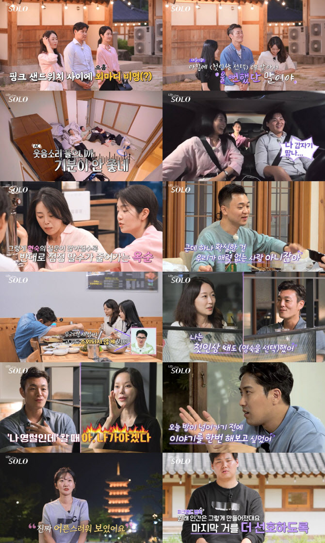 [이데일리스타in김가영기자]‘나는SOLO(나는솔로)’23기가혼돈의로맨스서막을열었다.13일방송한SBSPlus와ENA의리얼데이팅프로그램‘나는SOLO’에서는첫데이트선택으로‘극과극’러브라인을탄‘솔로나라23번지’의이야기가펼쳐졌다.이날23기는솔로녀들이함께데이트나가고싶은솔로남을택하는방식으로,‘첫데이트선택’을돌입했다.영수는솔로녀들이모여있는숙소를향해,“9첩반상에밥먹고시원한‘아아’먹으러가자”라고외치며데이트신청을했지만아무의선택도받지못했다.반면영호는‘귀인데이트’를즐긴‘연상’옥순과자신의‘원픽’인현숙이모두데이트신청에응해‘2:1데이트’를하게됐다.영식은데이트를원했던순자가나와첫선택부터통했고,영철역시‘1순위’로꼽았던영숙에영자까지등장해,‘첫인상선택0표’의설움을시원하게씻었다.다만영철을선택한영숙-영자는모두‘1순위’영식대신영철을뽑았다는공통점이있었다.광수-상철은아쉽게‘0표클럽’이됐고,두사람은서로를포옹하며씁쓸함을달랬다.상철은“아닌척하려고노력많이했는데데미지를입을수밖에없더라”고‘고독정식’의아픔을호소했고,광수역시방에서왁자지껄메뉴를고르는‘커플남녀’의대화에“웃음소리들리니까기분안좋네”라며씁쓸해했다.‘2:1데이트’에나선영호는옥순-현숙을차에태운뒤맛집으로향했는데,운전중에고라니를만나는돌발상황을겪었다.이때영호와현숙은크게놀라소리친반면,옥순은침착하게대응했다.이와관련해옥순은제작진과의인터뷰에서“아이들을데려가는느낌이었다.사실은기대고싶고,남자가절리드했으면좋겠는데제가챙겨줘야하는느낌을받았다”고불편한기색을드러냈다.식당에도착한현숙은고기를잘굽지못한다는영호대신집게를잡았다.그러면서영호에게다양한질문을던져,데이트의주도권을잡았다.현숙의질문이많아질수록옥순은말수가없어졌고,식사말미현숙은‘이미지게임’을제안했다.현숙은“오늘온사람중에내‘1픽’이있다,없다?”라는질문을던졌는데영호는선뜻답하지못했다.이에옥순은영호의‘원픽’이현숙임을직감했지만,데이트를마친현숙은“단1%라도‘너다’라는느낌을받았으면좋겠지만그런느낌을받지못했다”라고아쉬워했다.‘0표클럽’광수-상철은‘짜장면건배’를한뒤0표의아픔을공유했다.상철은“아직보여준게없다”고셀프위로했고,광수역시“우리가매력없는사람은아니잖아,호감을표시한것도없다”라고맞장구쳤다.직후,제작진과의인터뷰에서광수는“여기서무슨경험을하더라도나한테는득이되는경험이고결론적으로시련이닥쳐도난언제든다시올라갈것”이라고긍정적인모습을보였다.자기소개를하며솔로녀들에게선물을돌렸던영철은영숙,영자와의데이트에서특급매너를선보였다.그는“남을챙기는거에서큰기쁨을느낀다”며,일일이고기를구워서두솔로녀의접시에놔줬다.첫인상선택‘0표’에서첫데이트‘2표’로올라선영철은“난너무행복해.지금소원이없어”라며웃었다.뒤이어‘1:1데이트’에서영철은영자에게자신이몇순위인지단도직입적으로물었다.영자는“영철님은2순위였다”고답한뒤,“일을하면서힘들어할때토닥토닥해줄수있을것같고,취미도비슷하다”고영철을택했던이유를밝혔다.영철은영숙에게도같은질문을던졌다.그러면서,“난영숙님이1순위다.인터뷰3번에다영숙님을얘기했다”고어필해영숙의마음을사로잡았다.영숙은“전혀몰랐다”며고마워했고,데이트후영철은제작진앞에서“제마음을못참는편”이라며‘1순위’영숙에이어,현숙과순자에게도관심이있음을털어놨다.영숙은“지금은일단영철님인데영식님이랑도데이트를해봐야할것같다”고이야기했다.‘동갑내기’영식-순자는데이트시작부터말을놓으며빠르게가까워졌다.순자는‘이상형’을묻는영식의질문에“그게없어.뭔가하나에꽂혀.주로웃긴거”라고‘유머코드’를중요한요소로꼽았다.영식은“자기일에열정적인사람이좋다.그감성이너무좋아서오늘밤이넘어가기전에얘기를하고싶었다”고‘자기소개타임’으로순자에게빠졌음을내비쳤다.순자는남성멤버들과함께일하면서연애의고충이있었음을솔직하게밝혔고,영식은“중요한포인트”라며“꿋꿋하게하는것도보기좋다.멋있네”라고일에대한순자의열정을칭찬했다.두사람은식사후커피를들고연화지를돌며낭만적인밤산책을즐겼다.영식은“예의,양보를아는사람이었으면좋겠다.‘미안하다’,‘고맙다’를달고사는게내스타일이니까성향은비슷했으면좋겠다”고자신의이성관을전했다.두사람은친근한‘하이파이브’로실제연인같은데이트를마무리했고,데이트후순자는“제가생각했던이미지랑달라서호감으로통했다.생각보다더어른스러워보였다”며만족스러워했다.영식역시“딱여름밤같은사람.매력이되게많은분”이라고호감을표현했다.옥순-현숙과데이트를마치고돌아온영호는마찬가지로현숙을‘2순위’로마음에둔영철에게“난동갑아니면연하인데자기소개때확실히밝히면다른쪽으로생각하실줄알았다”며‘연상’옥순의선택에대한당황스러움을내비치며“은근히현숙님한테말을다정하게했다고생각하는데이시그널
