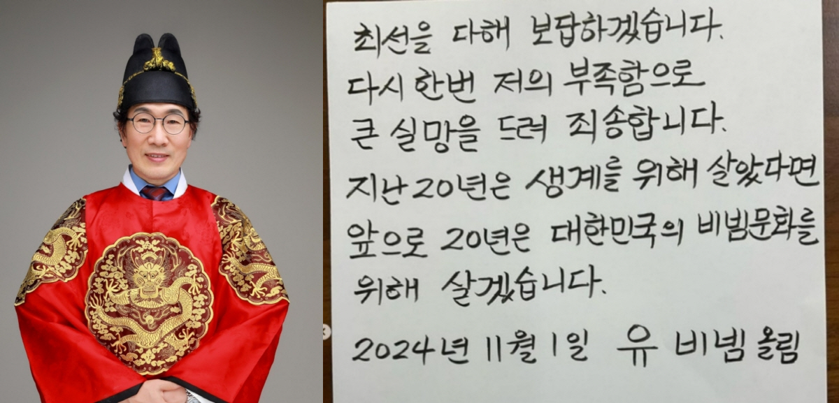 [스포츠조선조민정기자]넷플릭스'흑백요리사'에서'비빔대왕'으로인기몰이를했던유비빔씨가과거무허가영업등범법행위를일체고백했다.1일유비빔씨는자신의개인계정에자필편지를게재하며그간의잘못을인정하고사과의뜻을전했다.그는편지를통해"과거여러장사를시도했지만모두실패해2003년부터허가받지않은장소에서음식점을운영하다가결국구속됐고집행유예판결을받았다"며"이후1년간가게를폐업하고깊이반성했다"고밝혔다.그러면서그는생계를유지하기위해아내의명의로공연전시한식체험장사업자를등록해영업을이어갔지만이러한편법도그만두게됐다고전했다.유비빔씨는"떳떳하게음식점을운영하기위해여러공공기관에규제완화를요청하며매달렸지만뜻을이루지못했다"면서도"어떤이유로든법을어기는것은정당화할수없다는점을알고있다"고덧붙이며고개를숙였다.그는"일반인이었던제가갑작스럽게주목받는상황에서저와제아내는하루도마음편할날이없었다"고속내를전하기도했다.마지막으로유비빔씨는"앞으로는초심으로돌아가비빔현상을연구하고,비빔문자대백과사전집필에전념하겠다"며"20년간가꿔온비빔소리공간을모두가이용할수있는무료전시·공연장소로개방하겠다"고약속했다.그는또"앞으로20년은대한민국비빔문화를위해살겠다"며자신을응원해준이들에게감사와다짐의말을전했다.이하유비빔게시글전문.죄송스러운마음으로지난날저의잘못을고백하고자합니다.저는과일행상,포장마차,미용실까지여러장사를해왔지만,번번이실패하여2003년부터허가가나지않은곳에서음식점을운영하다구속돼집행유예판결을받았습니다.깊이반성했고,이후1년간가게를폐업했습니다.그러나목구멍이포도청이라아내명의로공연전시한식체험장사업자로등록해편법으로얼마전까지영업을했습니다.저는떳떳하게음식점을운영하기위해각공공기관및규제개혁위원회에규제를풀어달라고간절히호소하고매달렸지만그벽이너무높아저의뜻을이루지못했습니다.그러나어떤이유로든법을어기는것은정당화할수없음을잘알고있습니다.일반인이었던제가갑작스럽게이목이집중되는상황에서저와제아내는하루도마음편할날이없었습니다.이제저는초심으로돌아가비빔현상을연구하고,비빔문자대백과사전집필에전념하겠습니다.사죄하는마음으로제가20년동안혼신을다해가꿔온옛비빔소리공간은모두를위한비빔전시,비빔공연장소로서무료로개방하고,한옥마을로이전한비빔소리에서는합법적으로최고의재료로최선을다해보답하겠습니다.다시한번저의부족함으로큰실망을드려죄송합니다.지난20년은생계를위해살았다면,앞으로20년은대한민국의비빔문화를위해살겠습니다.2024년11월1일유비빔올림조민정기자[email protected]©스포츠조선.무단전재및재배포금지.