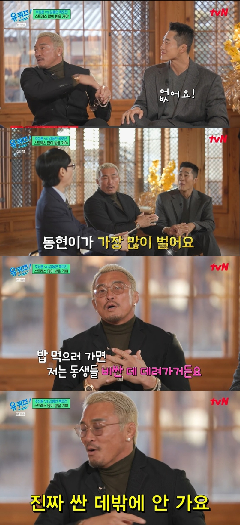 tvN예능프로그램'유퀴즈온더블럭'방송화면캡처(엑스포츠뉴스오수정기자)'유퀴즈'에서추성훈이김동현을크게당황시켰다.28일방송된tvN예능프로그램'유퀴즈온더블럭'에서는이종격투기선수겸방송인추성훈,김동현이출연해이야기를나눴다.이날방송에서추성훈은"이제는격투가아니고아저씨유튜버"라고소개했고,김동현역시"저도격투기선수아니고격투기채널을운영하는유튜버"라고소개해등장과동시에웃음을줬다.유재석은두사람에게"이제는대한민국을웃기는남자들아니냐"고했고,추성훈은"이것저것도전하고있다.새예능할때많이불러주시더라"면서고마워했다.김동현은"'피지컬아시아'이후해외팬이많아졌다.몽골갔는데다알아보시더라.몽골뉴스에도초대되서출연했다"고했고,추성훈은"제가시즌1에나와서화제가됐기때문에동현이도있는것"이라고말했다.추성훈은'아조씨무시하지마'를언급하면서"또래친구들이다힘이없다.일어나자마자힘들어한다.저도그느낌이뭔지안다.나이는어쩔수없다.또래친구들에게파이팅을주기위해서열심히달리고있다"면서웃었다.추성훈과김동현은서로의유튜브채널에대해언급하게도했다.김동현은"형을20년을알았다.식습관이사자다.그런데유튜브에서크림빵을먹더라.너무충격이었다"고했고,추성훈은"아예안먹지않고,가끔씩먹는다.그날이가끔먹는그날이었던것"이라고해명했다.그러면서추성훈은"동현이는유튜브에서동생들을잘챙기는것처럼보이지만잘안챙긴다.유튜브에서조회수때문에그러는거고잘안챙긴다"고폭로했다.이어"그리고동현이가돈엄청많으면서없는척을한다.우리가소속사가같아서얼마를버는지아는데,동현이가가장많이번다.돈도많으면서동생들밥사줄때저렴한곳만하고,동생들이불쌍하더라"라고말해김동현을당황시켜웃음을줬다.그리고김동현은추성훈과의첫만남을떠올리면서"그당시성훈이형은스타였고,저는밑바닥이었다.형이정말멋있었다.일본체육관은정수기가없어서,물을사서먹어야했다.저는돈이너무없어서수돗물마시면서했다.형이그걸보고물을주셨다.저는챙겨주신다고느꼈다.워낙스타셨으니까.그모습이아직도기억이난다"고회상하기도했다.사진=tvN방송화면오수정기자[email protected]©엑스포츠뉴스.무단전재및재배포금지.