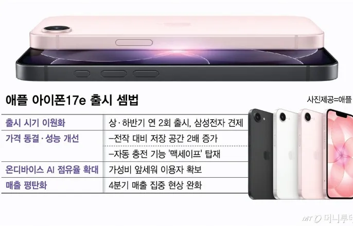 애플아이폰17e출시셈법/그래픽=김다나매년하반기플래그십출시에집중하던애플이'삼성전자의텃밭'인상반기에도전장을내밀었다.출시시기를연2회로늘리려는것.애플은'온디바이스AI'점유율확대와매출평탄화효과도노린다.애플은오는11일(현지시간)보급형스마트폰'아이폰17e'를정식출시한다고3일밝혔다.지난해2월'아이폰16e'출시후약1년만이다.아이폰SE1·2·3세대등그간출시된애플의보급형스마트폰과달리2년연속정식넘버링으로출시됐다.2~4년으로비정기적이었던출시주기도매년상반기로정리됐다.업계는e모델출시를정례화하려는의도로해석한다.애플은이날새'아이패드에어'도공개했다.회사는오는4일까지신제품을순차발표한뒤뉴욕·런던·상하이에서오프라인체험행사'애플익스피리언스'를열예정이다.매년상반기신제품공개행사'언팩'에서'갤럭시S'시리즈를공개하는삼성전자에맞불을놓는셈이다.삼성전자는폴더블(접이식)폰'갤럭시Z'시리즈가중심이되는하반기까지연2회언팩을연다.17e256GB(기가바이트)모델은전작(아이폰16e)128GB모델과같은가격(99만원)으로출시됐다.AI열풍으로메모리값이급등했지만저장공간이오히려2배늘었다.모델별로9만9000~29만5900원인상된'갤럭시S26'시리즈의약점을파고들었다.전작에서지원하지않았던자석기반자동충전기능'맥세이프'도탑재됐다.삼성전자는기술력으로맞선다.지난주공개된갤럭시S26은강력한AI와사생활보호기능'프라이버시디스플레이'등신기술을전면에내세웠다.비싸진만큼확실한성능을제공해'제값받는프리미엄'이미지를굳히겠다는전략이다.양사의상반기경쟁은갈수록심해질전망이다.애플은'아이폰18'을내년상반기에출시할계획인것으로전해진다.통상하반기였던출시시기를반년미룬다는것이다.대신애플은올해하반기첫폴더블폰을출시해△상반기기본형·보급형△하반기폴더블·고급형으로출시시기를이원화할전망이다.17e출시에는온디바이스AI시장점유율을높이려는목적도있다.비교적저렴한보급형모델로이용자를늘린다는셈법이다.17e는불과몇달전출시된일반형'아이폰17'과동일한'A19'칩셋이탑재됐다.또17e는자사온디바이스AI애플인텔리전스구동에필요한8GB램(RAM·임시저장메모리)이들어간것으로전해진다.신제품출시직후인4분기에집중되는제품매출이평탄해지는효과도기대된다.애플의지난해제품매출은4분기(1137억4300만달러)가가장높았고3분기(737억1600만달러)와1분기(687억1400만달러)가뒤를이었다.2분기(666억1300만달러)는4분기의58.6%에불과했다.한업계관계자는"삼성전자는17e와같은가격대인중고급형모델'갤럭시S26FE'를하반기출시할전망"이라며"그전까지17e는갤럭시S26보다는1년간가격이소폭떨어진'갤럭시S25'와경쟁하게될것"이라고설명했다.이찬종기자[email protected]©머니투데이&mt.co.kr.무단전재및재배포,AI학습이용금지.