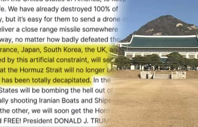 [앵커]오늘의주요뉴스입니다.트럼프대통령의호르무즈해협파병수위가높아지고있습니다.요청한미국,요청받은한국일본중국,4개국동시연결해서될지알아봅니다.이란의반격이만만치않습니다.탄도미사일을꺼냈습니다.괴물미사일이라불린다는데잠시후함께보시겠습니다.대리기사30명이당한아파트주차장이있다는데요.추적팀이그사연추적했습니다.뉴스에이시작합니다.저는동정민입니다.미국,이스라엘,이란간벌어져온중동상황이글로벌국제전으로확산될기로에섰습니다.미국이한국을포함해5개국에호르무즈해협을공동으로경비하자며군함을요청하더니,안하면암울한미래가있을거라며압박까지하고나섰습니다.지금미사일이날아다는싱황에서호르무즈해협에파병한다는게보통일이아니죠.지금미국,중국,일본특파원에청와대까지4원으로동시연결돼있습니다.먼저,워싱턴연결합니다.[기자]Q1.정다은특파원,오늘은5개국이아니라7개국에호르무즈호위를요구했다고했다던데,7개국어디입니까?우선트럼프는7개국에참여요구를했다고밝혔습니다.전날언급한한국을포함한5개국보다2곳더늘어난겁니다.[도널드트럼프/미국대통령]"관련된나라는7개국입니다.미국을지원하든안하든분명히말할수있는건우리는(누가어떻게했는지)기억할것이라는겁니다."현지시각그제와어제이국가들에접촉했다면서,'긍정적반응을보인곳이있다',이렇게주장했습니다.다만어떤나라들인지는구체적으로밝히진않았는데요.앞서트럼프는나토를거론하면서,"응답이없거나부정적반응을보인다면암울한미래에직면할것이다”라면서노골적으로동맹국압박에나서기도했습니다.트럼프는동맹국말고도중국을콕집어수차례언급했는데요.중국의참여가능성에대한질문엔"아직말할수있는시점이아니"라고만답변했습니다.Q2베이징이윤상특파원,중국예상치못한요청인데,반응이어떻습니까?안보내겠죠?중국외교부는오늘브리핑에서군함파견에대해"각국과소통을유지하며상황완화를위해노력하고있다"고밝혔습니다.또"각국이군사행동을즉시중단해야한다"고언급했습니다.호르무즈해협에군함을파견하는것에사실상반대의사를밝힌것입니다.다만,미중정상회담을앞둔만큼미국을자극하지않기위해발언수위에신중을기하는모습이었습니다.중국관영매체들은"호르무즈해협의위기를애초에누가촉발한것이냐"며미국을비난하고있는데요.글로벌타임스는"불을질러놓고불끄는걸돕고비용도나눠내자고요구한다"며"해협긴장의원인은해군함정이부족해서가아니라현재진행중인전쟁때문"이라고꼬집었습니다.또"여러국가군함으로해협을채우는건분쟁의불씨를만드는것"이라며"한척이라도공격받는다면그여파는누구도통제할수없을정도로빠르게확산될것"이라고덧붙였습니다.Q3정다은특파원사이가안좋은중국은왜들어갔을까요?원하는게뭘까요?한마디로하자면,중국이호르무즈해협을통과하는석유를많이쓰니그만큼책임을지라는주장입니다.직접들어보시죠.[도널드트럼프/미국대통령]"호르무즈해협은사실중국을비롯한여러나라를위한곳인데왜우리가그곳을지키고있는겁니까?왜그나라들이하지않는거죠?"중국이호르무즈해협을통해전체석유의90%를들여온다면서이렇게얘기한건데요.절박한나라들이책임지라는논리를강조하기위한것으로보입니다.Q4이윤상특파원미중정상회담진짜연기할지관심인데,연기하는게중국에게압박이됩니까?중국외교부는"정상외교는미중관계에있어대체할수없는것"이라고밝혔습니다.그러면서"미중양측은트럼프대통령의방중과관련해소통을유지하고있다"고했습니다.외교가에선미국과중국모두정상회담개최가필요하기때문에결국열릴것으로기대하는의견이많습니다.다만,트럼프의이번발언은중국이적극적으로이란편에서서미국에맞서는대신,신중한태도를취하도록압박하는효과는거둘수있다는분석이나옵니다.Q5.이번엔도쿄나가있는송찬욱특파원에게물어볼게요.일본이가장발등에불,당장사흘뒤정상회담만나야하잖아요.보낼분위기인가요?현재로서는신중한분위기입니다.오늘다카이치총리가트럼프대통령의호르무즈해협군함파견요구에대해국회에서처음입장을밝혔는데요.파견한다,안한다확답없이방안을검토중이라고만말했습니다.[다카이치사나에/일본총리]"아직(공식적인)요구가없었기때문에가정에대해답변은하기어렵습니다.일본정부로서는필요한대응방안을검토중입니다."[고이즈미신지로/일본방위상]"현시점에서자위대파견은고려하지않고있습니다."고이즈미방위상이'현시점'이라고전제를붙인만큼입장이바뀔수있다는전망도나옵니다.특히현지시각19일미국에서미일정상회담이열릴예정인데요.트럼프미국대통령이직접압박에나설경우어떤형태로든대응이필요하기때문입니다.다만일본현행법상호르무즈해협에자위대를파견하는것은현실적으로쉽지않습니다.자위대법등에따른파병요건인'존립위기사태'등에해당하지않는다는게일본정부의현재판단입니다.또미국의이란공격이합법적이라는판단도해야하는데,다카이치총리는평가자체를유보하고있습니다.이에일본에서는2019년미국과이란충돌당시아베전총리의우회전략도거론됩니다.니혼게